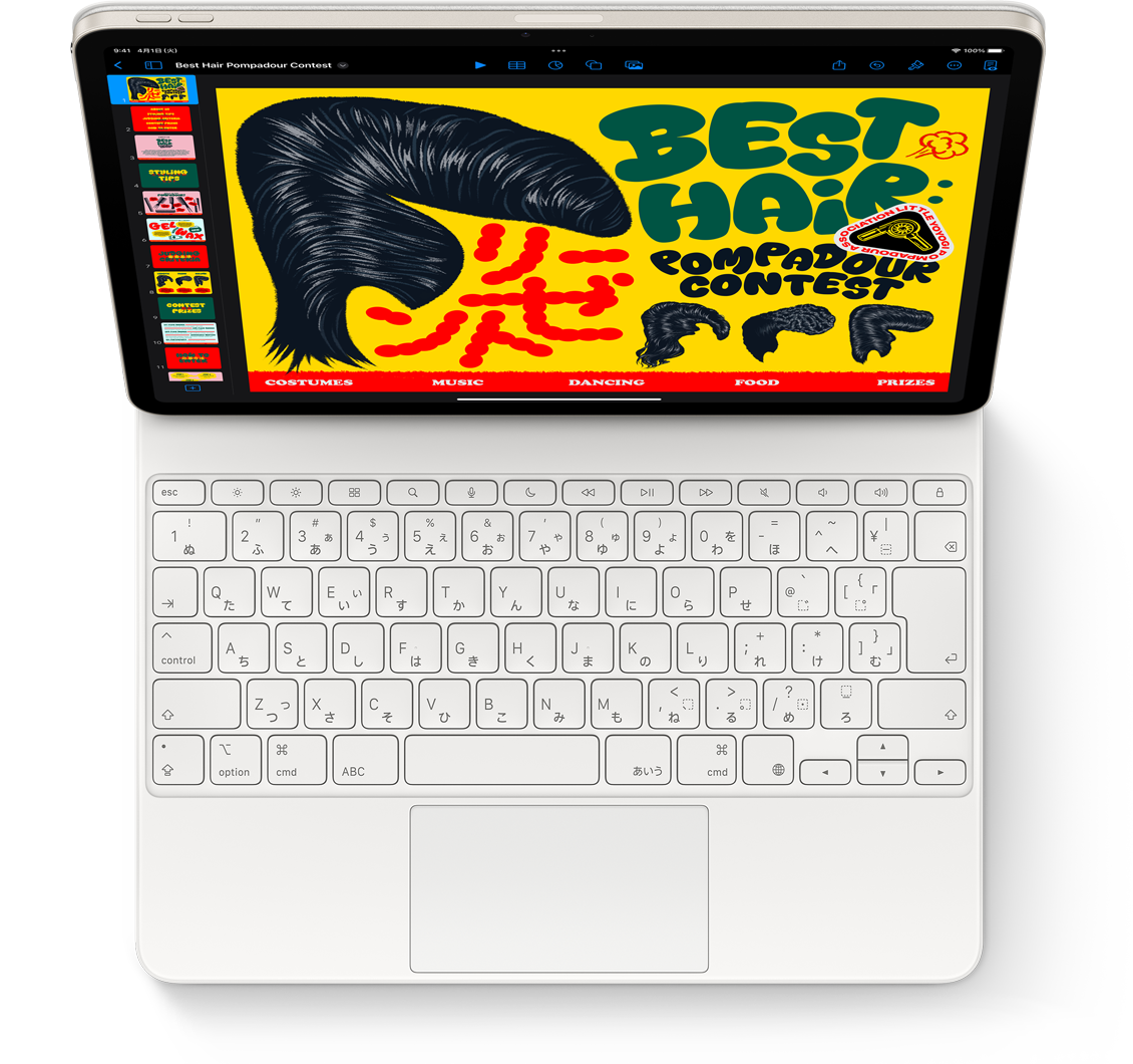 Magic Keyboardは、iPad Airの完璧なパートナー。薄くてポータブルなデザインに、驚くほど快適なキーボードとトラックパッドを搭載しているので、高い精度が求められるタスクに理想的です。キーボードに追加された14のファンクションキー列。パススルー充電に対応したUSB-Cコネクタ。前面と背面をしっかり守るカバー。画面を様々な角度にスムーズに調整できるフローティングカンチレバーと、iPadOSでの作業方法を広げる大きなガラス製トラックパッドも魅力です。