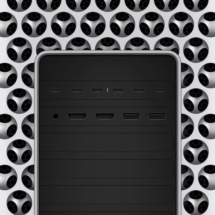 Mac Proの先進的な接続機能が一段と豊富になりました。Thunderboltポートは8つ用意。2つのHDMIポートは高帯域の48Gb/s HDMIに対応し、最大8Kの解像度と最大240Hzのリフレッシュレートをサポートします。ワイヤレス接続機能もさらに進化し、Wi‑Fi 6E14とBluetooth 5.3に対応しました。