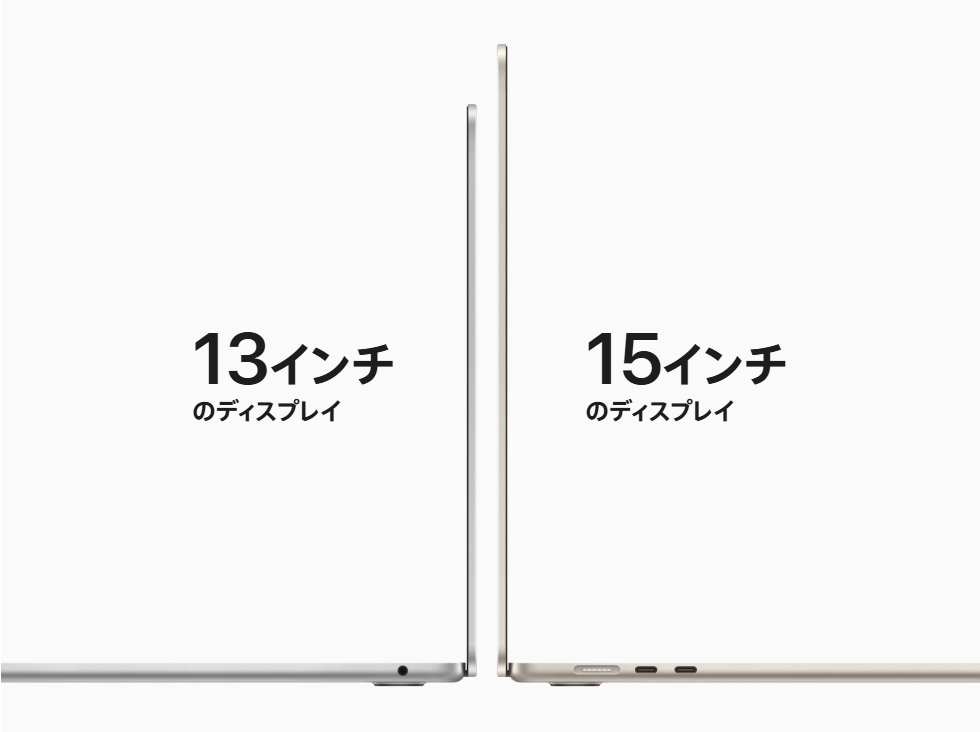 ※2 スクリーンのサイズは対角線を測ったものです。13インチと15インチMacBook Airのディスプレイは上部の隅が丸みを帯びています。標準的な長方形として対角線の長さを測った場合のスクリーンのサイズは13.6インチと15.3インチです(実際の表示領域はこれより小さくなります)。
