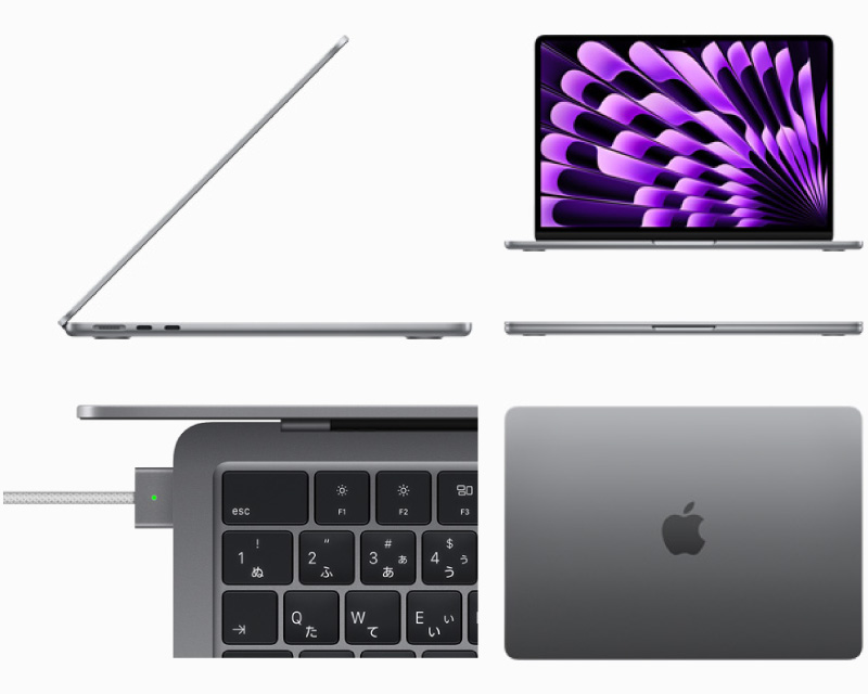 ※3 8コアCPU、10コアGPUのApple M3搭載15インチMacBook Air試作モデルと、8コアCPU、8コアGPUのApple M3搭載13インチMacBook Air試作モデルを使用し、2024年1月にAppleが実施したテスト結果によります。すべてのシステムに8GBのRAMと256GBのSSDを実装。8GBのRAMと256GBのSSDを装備した8コアCPU、8コアGPUのApple M2搭載13インチMacBook Air試作モデルを使用し、2022年5月にAppleが実施したテスト結果によります。ワイヤレスインターネットテストでは、ディスプレイの明るさを最低輝度から8回クリックした状態で、25の一般的なウェブサイトを閲覧し、バッテリー駆動時間を測定しました。Apple TVアプリのムービー再生テストでは、ディスプレイの明るさを最低輝度から8回クリックした状態で、HD 1080pコンテンツを再生し、バッテリー駆動時間を測定しました。バッテリー駆動時間は使用条件と構成によって異なります。詳しくは メーカーページ をご覧ください。