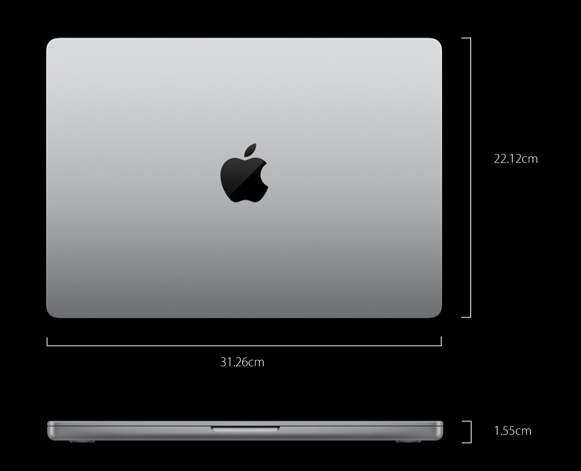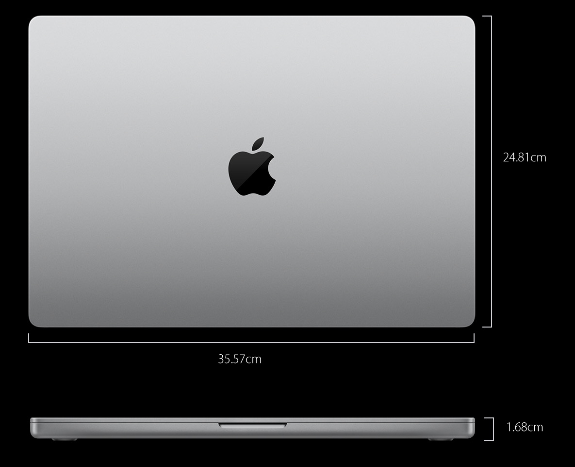 ※ 14インチMacBook Proと16インチMacBook Proのディスプレイは上部の隅が丸みを帯びています。標準的な長方形として対角線を測った場合のスクリーンのサイズは14.2インチと16.2インチです(実際の表示領域はこれより小さくなります)。