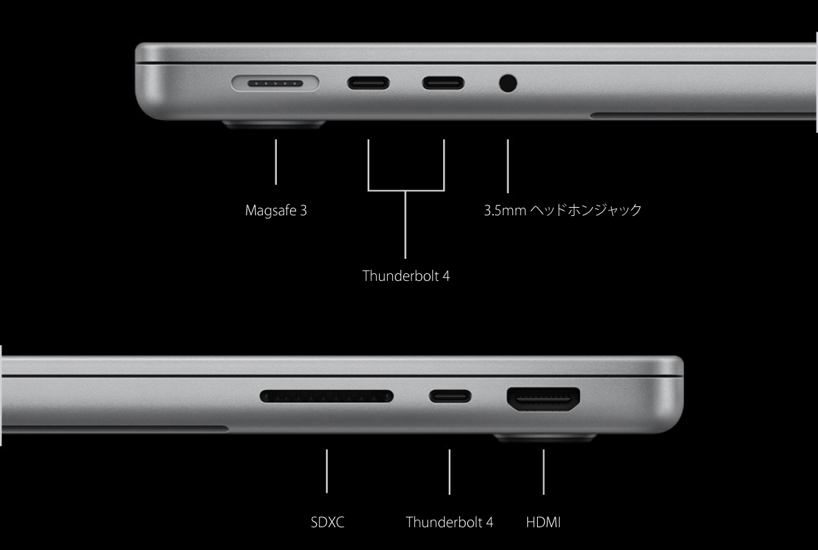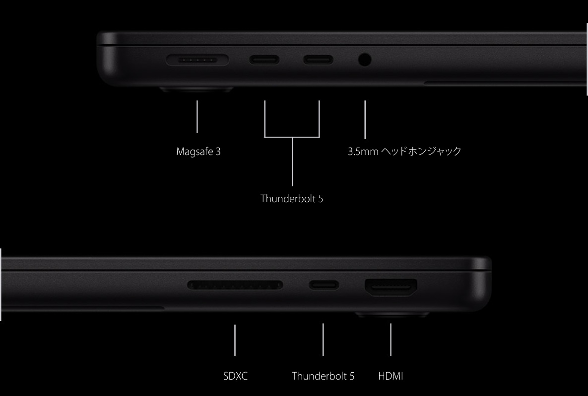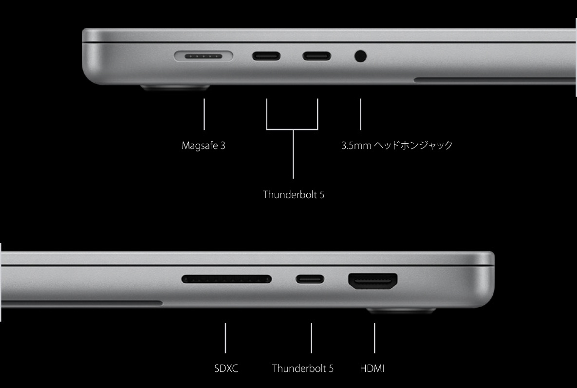 すべてのモデルに、3つの Thunderbolt 4ポートまたは Thunderbolt 5ポート、HDMIポート、MagSafe 3ポート、SDXCカードスロット、ヘッドフォンジャックを搭載※。高速周辺機器を接続したり、写真を転送したり、複数の外部ディスプレイと組み合わせたり、すばやく充電できます。