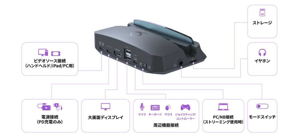 この AVerMedia GC515 ですが、純正ドックとのリプレイスとして利用可能で純正ドックのように「TVへ出力する機能」「本体の充電」のほか、「プレイ動画の録画・高画質保存」、「SNS共有用の動画作成」、「配信用の映像出力」といった、現代のゲームライフには欠かせないプラスアルファの要素が備わっています。特にプレイ動画の保存は、microSDカードさえあれば他に機器や接続を必要としないのでとりあえず録画しておいてあとからPCで編集といった使い道もできます。
